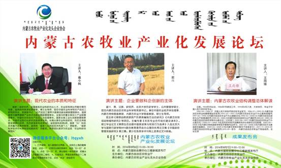 綠博會期間,由自治區(qū)農牧業(yè)廳主辦、內蒙古農牧業(yè)產業(yè)化龍頭企業(yè)協(xié)會承辦的內蒙古農牧業(yè)產業(yè)化發(fā)展論壇如期舉行。論壇旨在推動現(xiàn)代農牧業(yè)發(fā)展方式轉變,聚焦農牧業(yè)供給側結構性改革和互聯(lián)網+發(fā)展思路,邀請區(qū)內外農牧業(yè)領域知名專家和學者現(xiàn)場傳授,共同探討,共享綠博會成果,共商產業(yè)發(fā)展大計。論壇同期發(fā)布第四屆內蒙古名優(yōu)特農畜產品和第三屆包裝設計大賽評審結果,內蒙古日報、農民日報82日第四版同時公布獲獎名單,敬請關注。